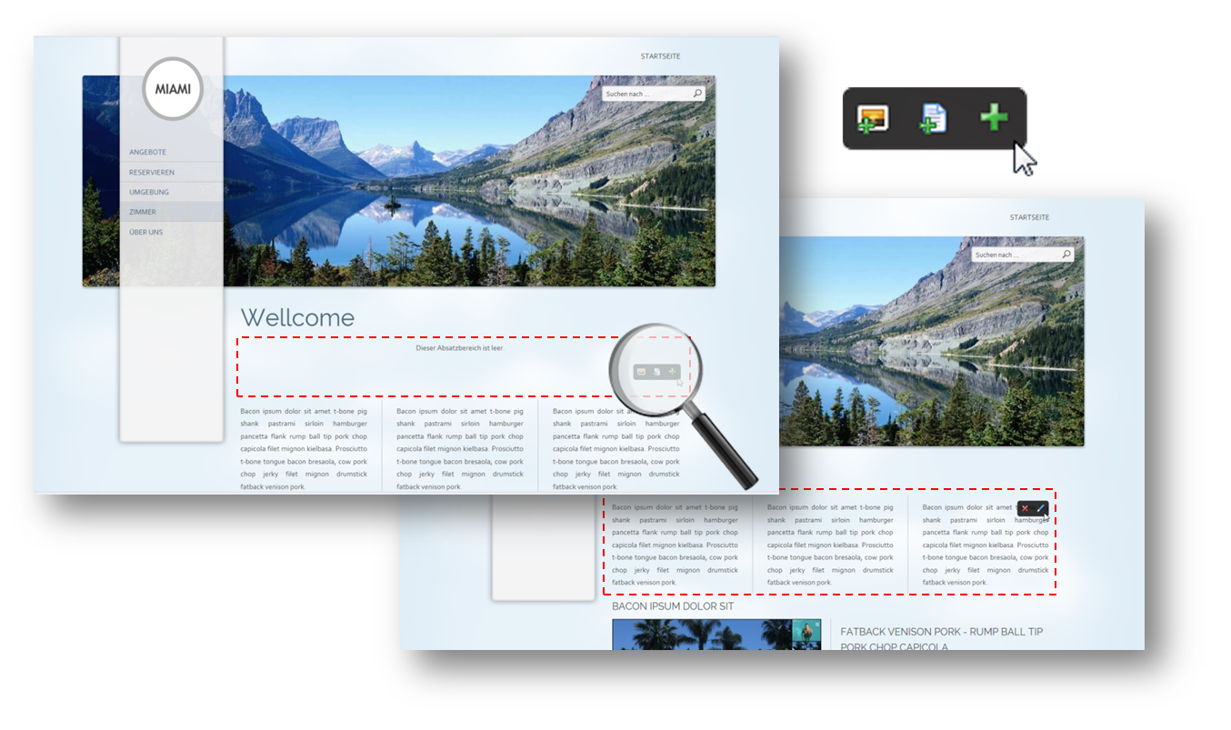 Der Live-View-Modus ermöglicht Ihnen jederzeit die volle Kontrolle, was den aktuellen Bearbeitungsstand Ihrer Website anbelangt. Falls Sie einen bereits bestehenden Absatz bearbeiten wollen, klicken Sie einfach das Stift-Symbol an.